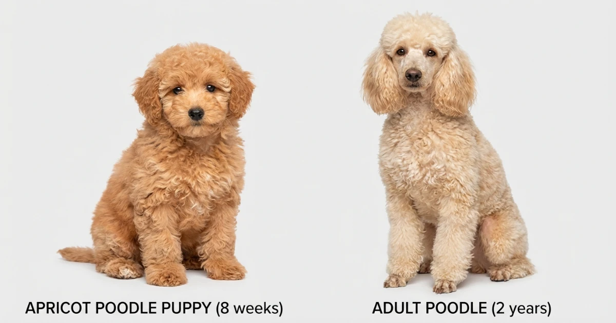 Apricot poodles commonly lighten as they mature. A puppy that looks richly peachy at 8 weeks may look softer and creamier at 2 years old. That is normal. It is not a sign that something went wrong. It is simply part of how many warm poodle coats evolve over time.